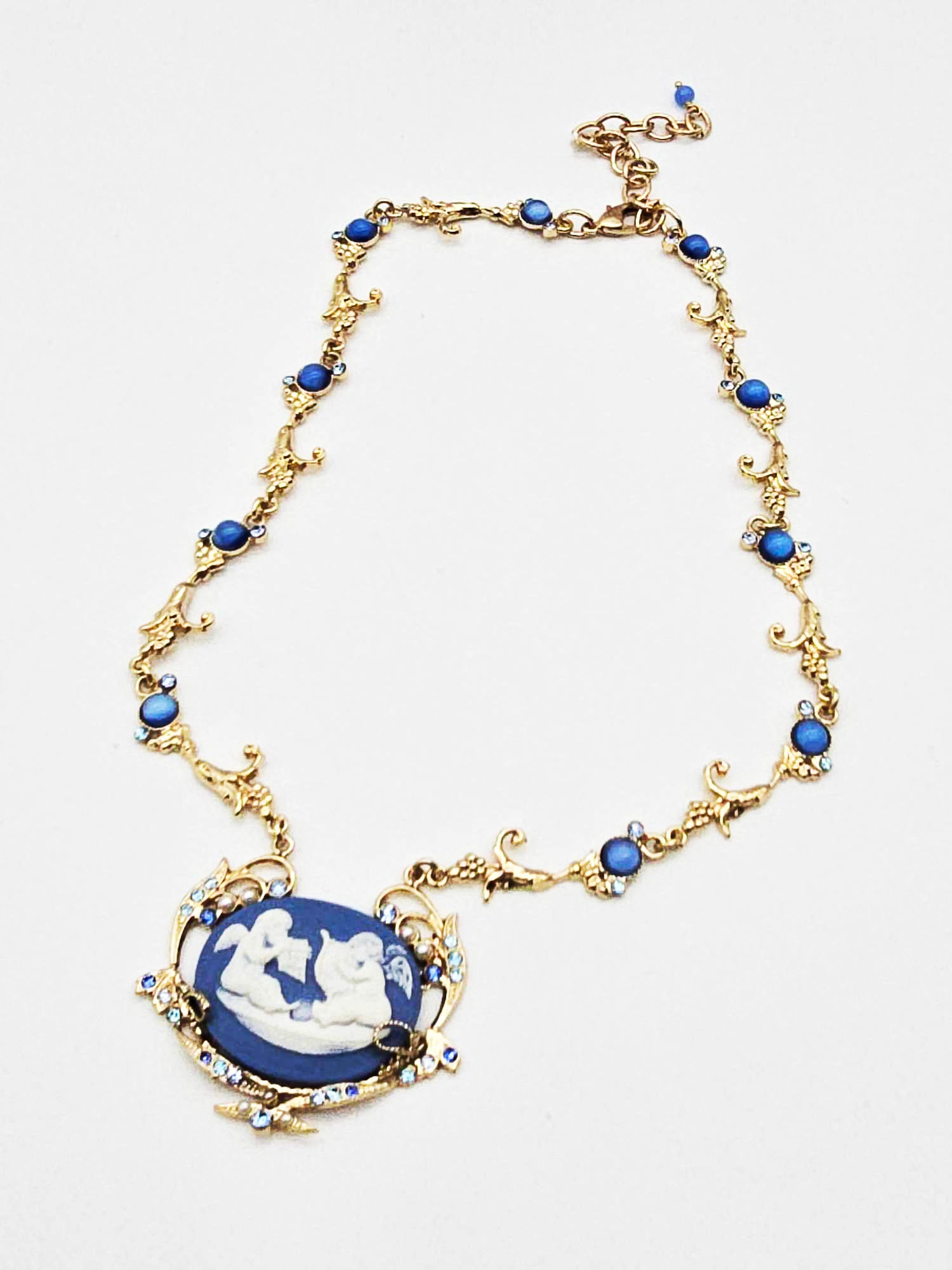 16" Adjustable Brass Filigree with Blue Stones & Pearls and Porcelain Cherub Cameo Necklace